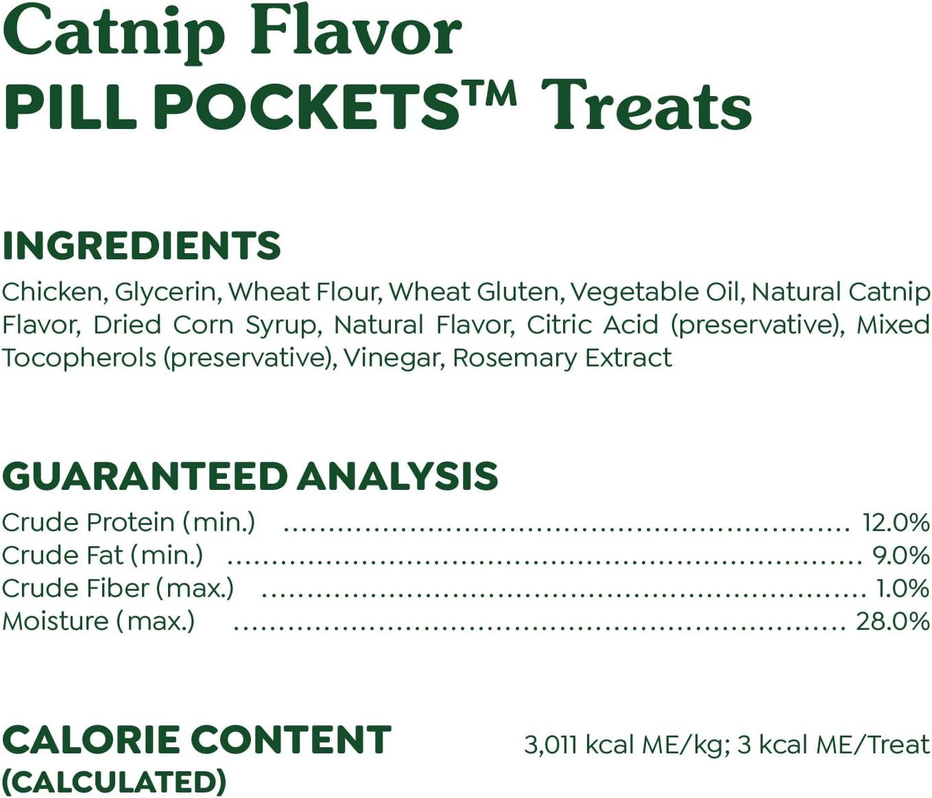 Take the stress out of giving your cat their medicine. Feline Greenies Pill Pockets Treats for Cats easily hide most tablet-sized and capsule-sized pills in a great-tasting meaty treat that’s Made with natural ingredients plus minerals and trace nutrients. These soft cat treats are the #1 vet recommended choice for giving pills* and feature a delicious catnip flavor that helps disguise the taste of the medicine. It's the hassle-free way to give your cat medicine… just place their medicine inside the pocket, pinch the pocket closed to secure the pill or capsule, and share with your cat. Just like that, the treat (and medicine) disappears. When it comes to taking meds, your cat is smart. But you're smarter… because you've got Feline Greenies Pill Pockets Cat Treats. * Based on a survey of U.S. veterinarians