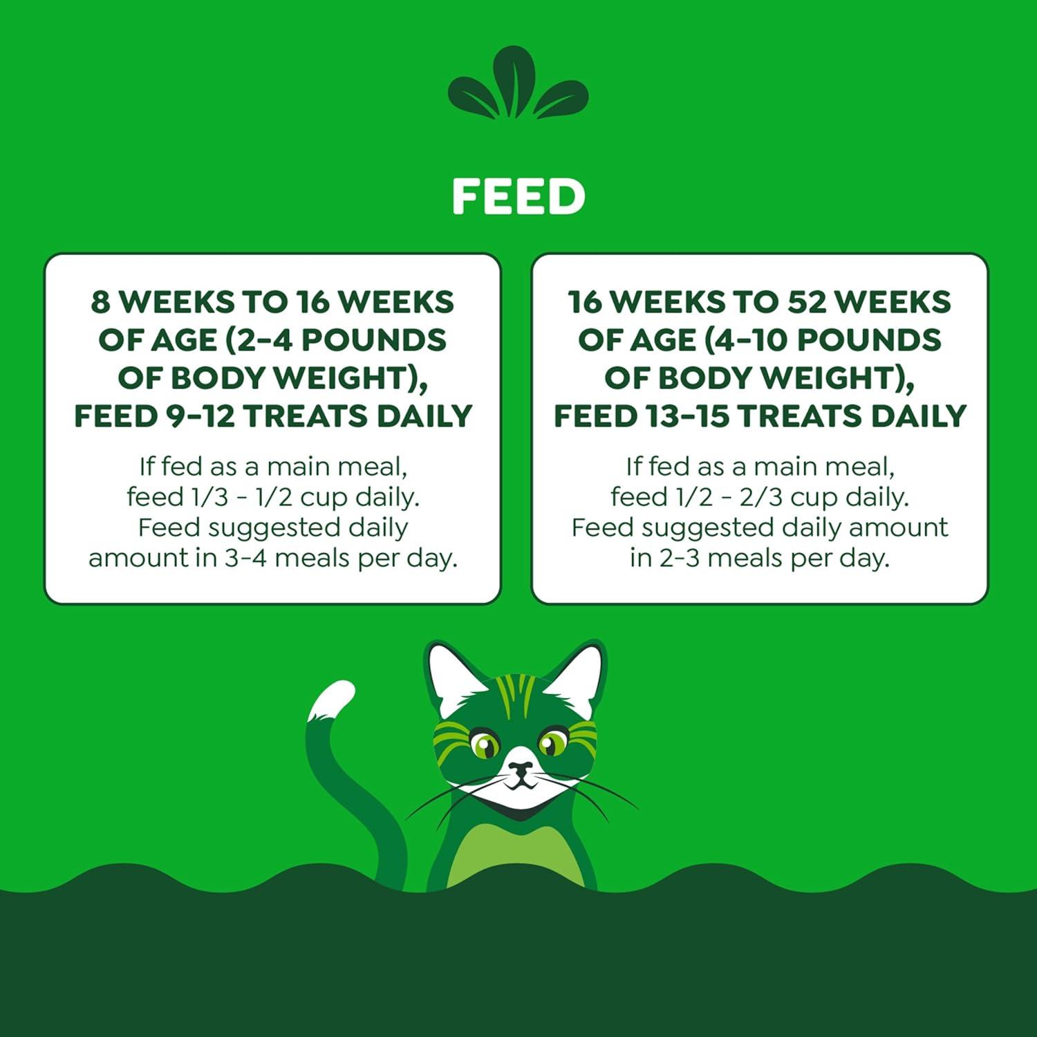 Made for growing kittens, FELINE GREENIES SMARTBITES Healthy Kitten Treats in a delicious chicken flavor are a healthy snack kittens will love. Soft on the inside and crunchy on the outside, these dual texture treats are made with DHA for brain and vision development and are formulated to support the needs of a growing kitten. With less than 2 calories per treat, these bite-sized snacks are great for kitten training or daily treating. Made with natural ingredients and no artificial flavors, preservatives or fillers, FELINE GREENIES SMARTBITES are the nutritious daily treat your feline friend deserves. Trace amounts of preservatives may be present due to potential cross-contact during manufacturing.