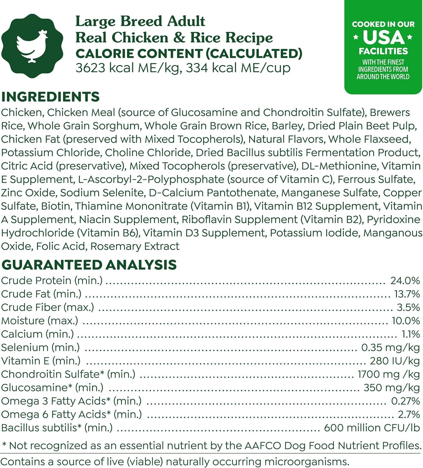 The Greenies brand is on a mission to promote your dog’s well-being from teeth to tail! Greenies Smart Essentials Adult Large Breed High Protein Dry Dog Food Real Chicken & Rice Recipe offers science-backed nutrition with an irresistible taste. This nutritious dry dog food for Large breed adult dogs features real chicken as the #1 ingredient and is designed to help support 6 key areas of your dog’s health: digestion, immune system, teeth, skin & coat, bones & joints, and muscles, including the heart. Greenies Smart Essentials Adult Large Breed Dry Dog Food is formulated without corn, wheat, soy, or chicken by-product meal, and no artificial flavors or fillers*. With a natural source of glucosamine and chondroitin and Made with natural ingredients plus vitamins, minerals, and nutrients, Greenies Smart Essentials Adult Large Breed High Protein Dry Dog Food is guaranteed to bring joy to mealtime with tail-wagging flavor. Love it or your money back! *Trace amounts may be present due to potential cross-contact during manufacturing